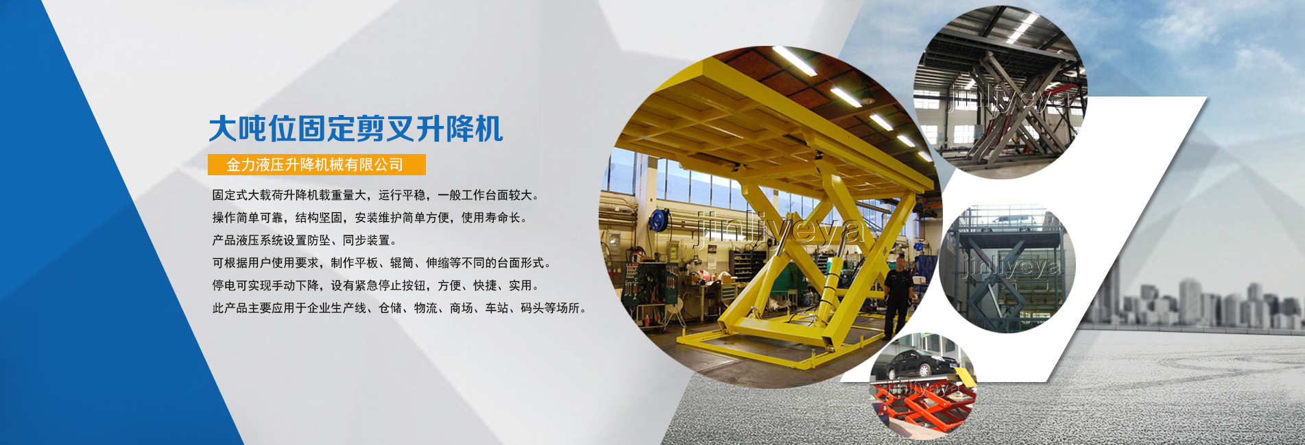 金力公司主要致力于液壓升降機(jī)械的研發(fā),主導(dǎo)產(chǎn)品有高空作業(yè)平臺(tái)、液壓升降機(jī)、升降平臺(tái)、登車橋等十幾個(gè)系列。...